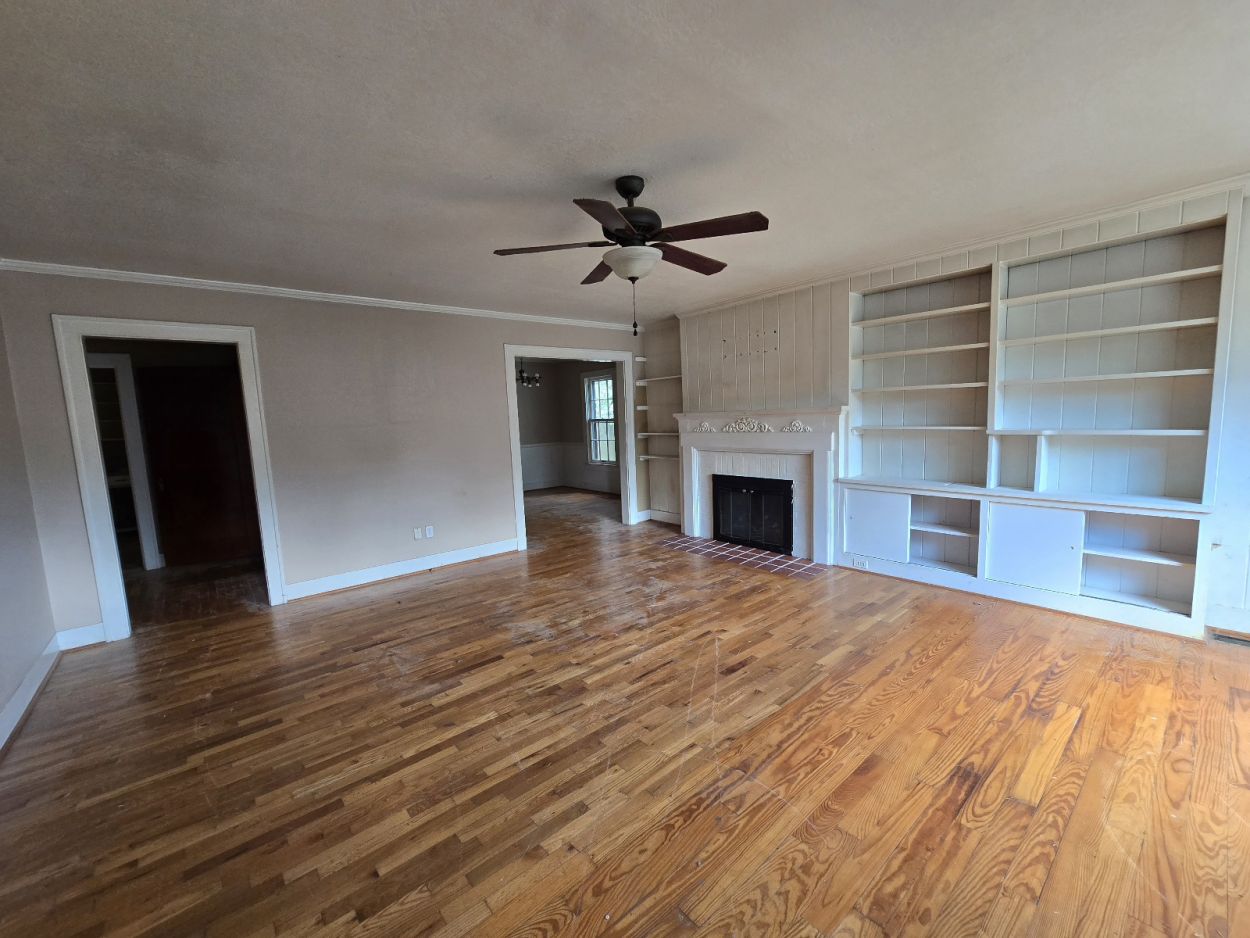 The home features not just one, but two separate living areas a bright, welcoming living room with built-in shelving and a cozy fireplace, and a family room perfect for relaxing or entertaining. A dedicated dining room offers space for gatherings, while the kitchen provides ample cabinet storage and countertop space, ready for your personal touch.